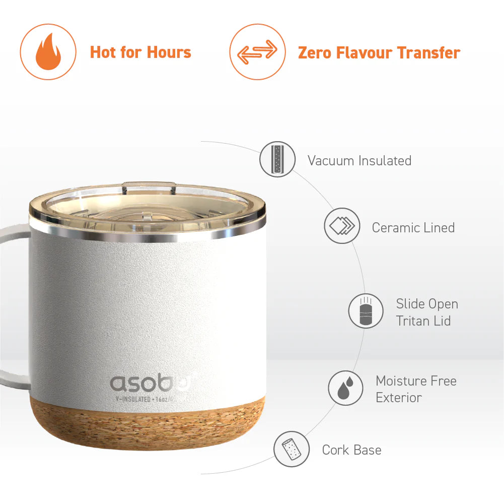 Enhance your daily coffee routine with the White Infinite Mug. The ceramic coating preserves the taste of your coffee, while the cork bottom doubles as a coaster. Its double-walled, vacuum insulated stainless steel design ensures your drink stays hot for hours, and the slide-to-close lid prevents spills.